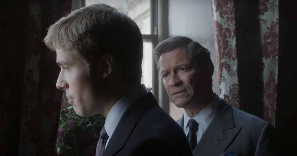 En este punto, la discusión se ha acalorado y Guillermo le grita a Carlos: “¿No crees que hay una conexión entre donde estamos todos ahora y tu parte en ello?”, a lo que el padre le dice que espera que no esté “insinuando lo que creo que estás insinuando”, recordándole a su hijo que la muerte de la princesa Diana fue un accidente. “Pero el hecho de que ella estaba en París con ese hombre, sin protección… Ella debió haber estado a salvo con nosotros, y que ella estuviera allá fue tu culpa. No, tú no conducías el auto, pero la condujiste a los brazos de ellos al hacer tan infeliz por amar a alguien más”, le contesta Guillermo, en una clara alusión a la relación de Carlos con Camilla Parker-Bowles. La escena termina, pasa el tiempo y al final del episodio vemos a Guillermo y Carlos reconciliarse bajo consejo del príncipe Felipe (Jonathan Pryce).