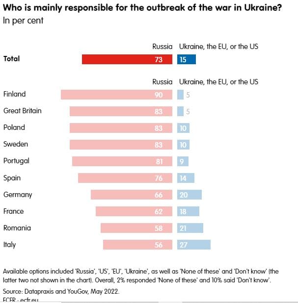 La maggior parte degli intervistati ha risposto che la responsabilità del conflitto in Ucraina è della Russia, con uno schiacciante 73%. L’aspetto interessante è che, se in Finlandia questa opinione è condivisa dal 90% dei partecipanti, in Italia la percentuale è pari al 56%, ovvero il dato più basso. Di contro, nel nostro Paese si pensa che la responsabilità della guerra è attribuibile sia all’Ucraina che all’Unione Europea e Stati Uniti: la percentuale di questa opinione è del 27%, praticamente quasi un italiano su tre.