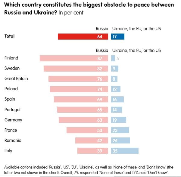 Anche in questo caso la maggior parte degli intervistati ha individuato nella Russia il principale ostacolo alla pace, dato che comunque cambia da Paese a Paese: si va da un 87% della Finlandia che via via decresce man mano che si va verso i paesi neolatini: Spagna 69%, Francia 56% e Italia 39%. Anche in questo caso siamo il Paese con più tendenza filorussa: per il 35% degli intervistati l’ostacolo alla pace è rappresentato dall’Ucraina e un altro 28% lo attribuisce agli Stati Uniti.