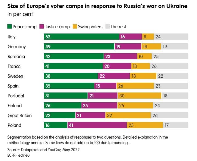 In linea generale, dal report si possono distinguere tre macro gruppi: quelli che vogliono la pace (il 35% degli europei), quelli che chiedono giustizia (il 22%) e quelli che si trovano in mezzo (il resto degli intervistati). Su questo fronte l’Italia è lo Stato che vorrebbe la pace il prima possibile, a ogni costo, anche a discapito di perdite territoriali a danno dell’Ucraina: è l’opinione del 52% degli intervistati italiani, seguita da un 16% che pensa all’integrità territoriale dell’Ucraina e giustizia contro l’aggressione russa. Di contro, in Polonia il 16% vuole la pace e il 41% vuole che sia fatta giustizia.