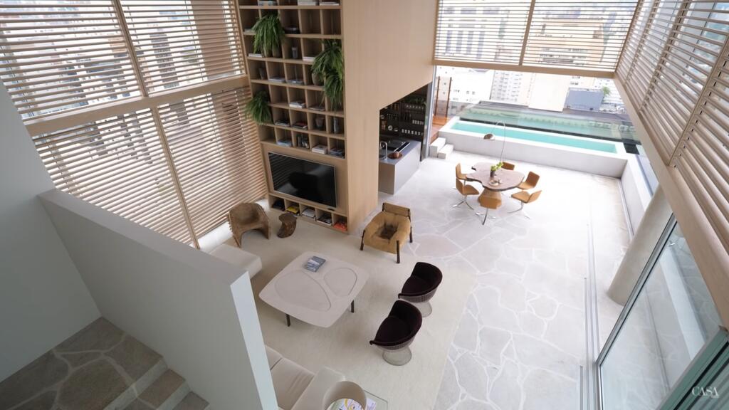 O espaço do duplex é amplo, com 655 m², e tem tons de madeira, branco e bege. A sala de jantar tem uma mesa de 14 lugares, e a piscina de borda infinita fica na varanda, com acesso à área de churrasqueira. Um destaque vai para a estante gigantesca, que é difícil de ser alcançada até mesmo com uma escada.