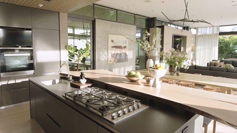 Zona de piscină e una de vis și cu toții ne putem imagina cum ne-am relaxa în ea dacă am avea șansa să fim acolo pentru o zi. Bucătăria pare să includă tot ce ai avea nevoie dacă îți place să gătești și pare că vine la pachet cu o priveliște foarte drăguță către curtea interioară.