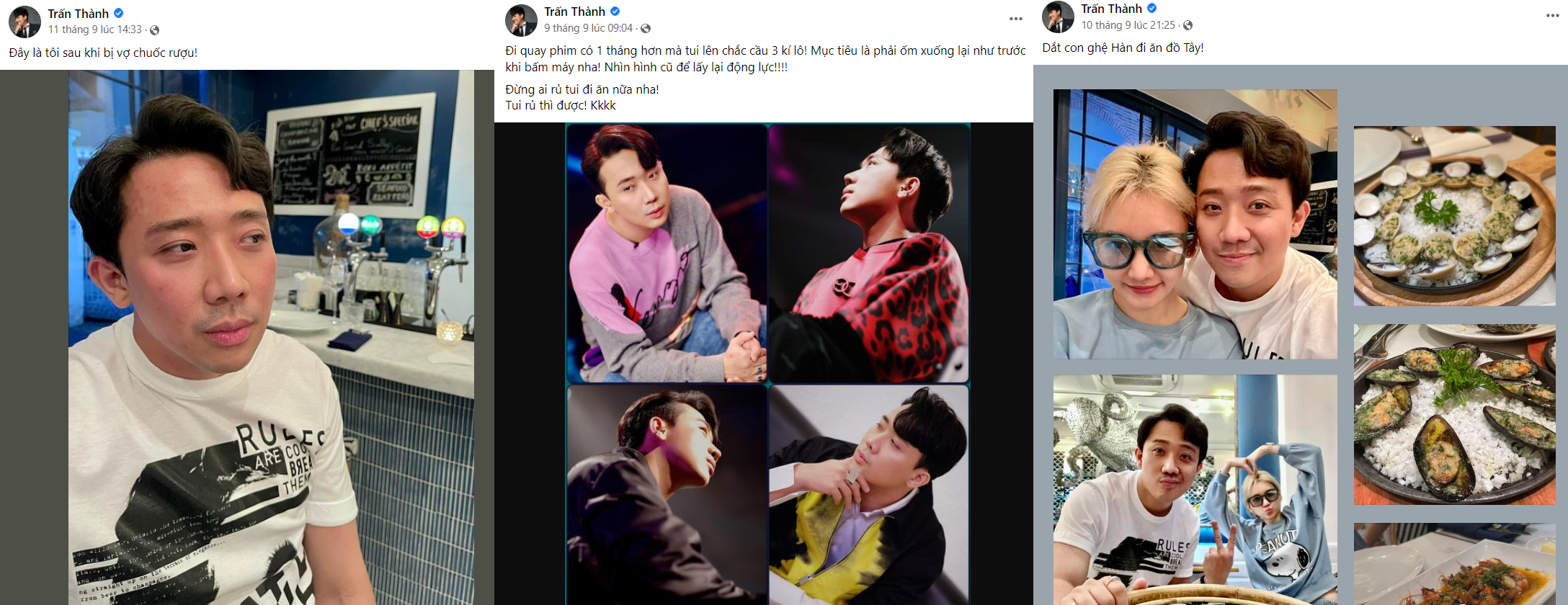 Lần gần nhất, anh đăng tải khoảnh khắc vẻ mặt phờ phạc, ngu ngơ, nửa tỉnh nửa mơ của mình sau khi bị bà xã Hari Won chuốc rượu khiến người hâm mộ không khỏi phì cười. Trước đó, nam nghệ sĩ 8X than phiền về trạng thái tăng cân chỉ sau 1 tháng tham gia bộ phim mới và đặc biệt dặn dò bạn bè và fan hâm mộ rằng “đừng ai rủ tui đi ăn nữa”. Dù than phiền là vậy, chỉ 1 ngày sau, thánh ăn này đã “trêu ngươi” cộng đồng mạng khi “ngang nhiên” chia sẻ hình ảnh rủ “ghệ” (Hari Won) đi ăn loạt món ăn kiểu Tây hấp dẫn.