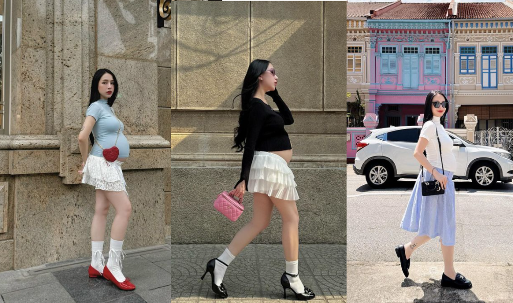 Ở những tháng cuối thai kỳ, khi chiếc bụng bầu bắt đầu to dần, nếu các mẹ bầu thường ưu tiên lựa chọn các trang phục bầu rộng rãi hack dáng thì Joyce Phạm lại chọn cách đi ngược xu hướng. Bà mẹ Gen Z khéo léo kết hợp các trang phục năng động như chân váy ngắn và croptop hoặc áo thun ôm co giãn.