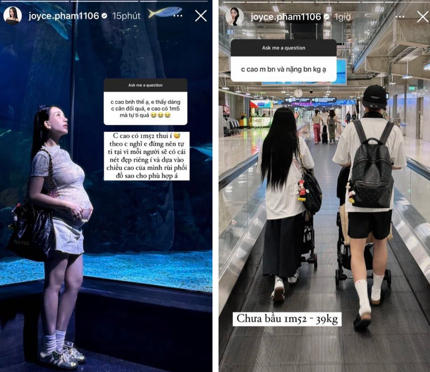 Trước khi lên chức mẹ, Joyce Phạm sở hữu body nhỏ nhắn với cân nặng chỉ 39kg. Đây có thể là một trong những lý do giúp vóc dáng ái nữ nhà Minh Nhựa không quá nặng nề trong giai đoạn bầu bí. Tuy nhiên, điều quan trọng là Joyce Phạm luôn chú trọng đến việc chăm sóc, giữ dáng giai đoạn trước và sau khi sinh con.