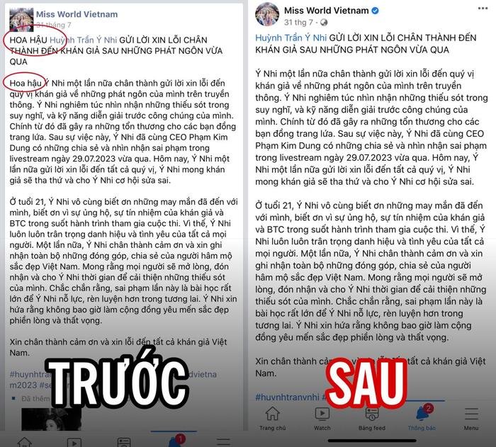 Trong khi nhãn hàng có động thái “quay xe” gắt gao thì ban tổ chức Miss World Vietnam cũng có hành động vô cùng khó hiểu. Ngày 31/7, fanpage Miss World Vietnam 2023 đăng tâm thư xin lỗi với tựa đề “Hoa hậu Huỳnh Trần Ý Nhi gửi lời xin lỗi chân thành đến khán giả sau những phát ngôn vừa qua”. Tuy nhiên, sau đó hơn 1 tiếng, danh xưng “Hoa hậu” đã được xóa trong tất cả các nội dung của bài viết. Điều này khiến cộng đồng mạng bán tín bán nghi về sự thay đổi của ban tổ chức Miss World Vietnam 2023.