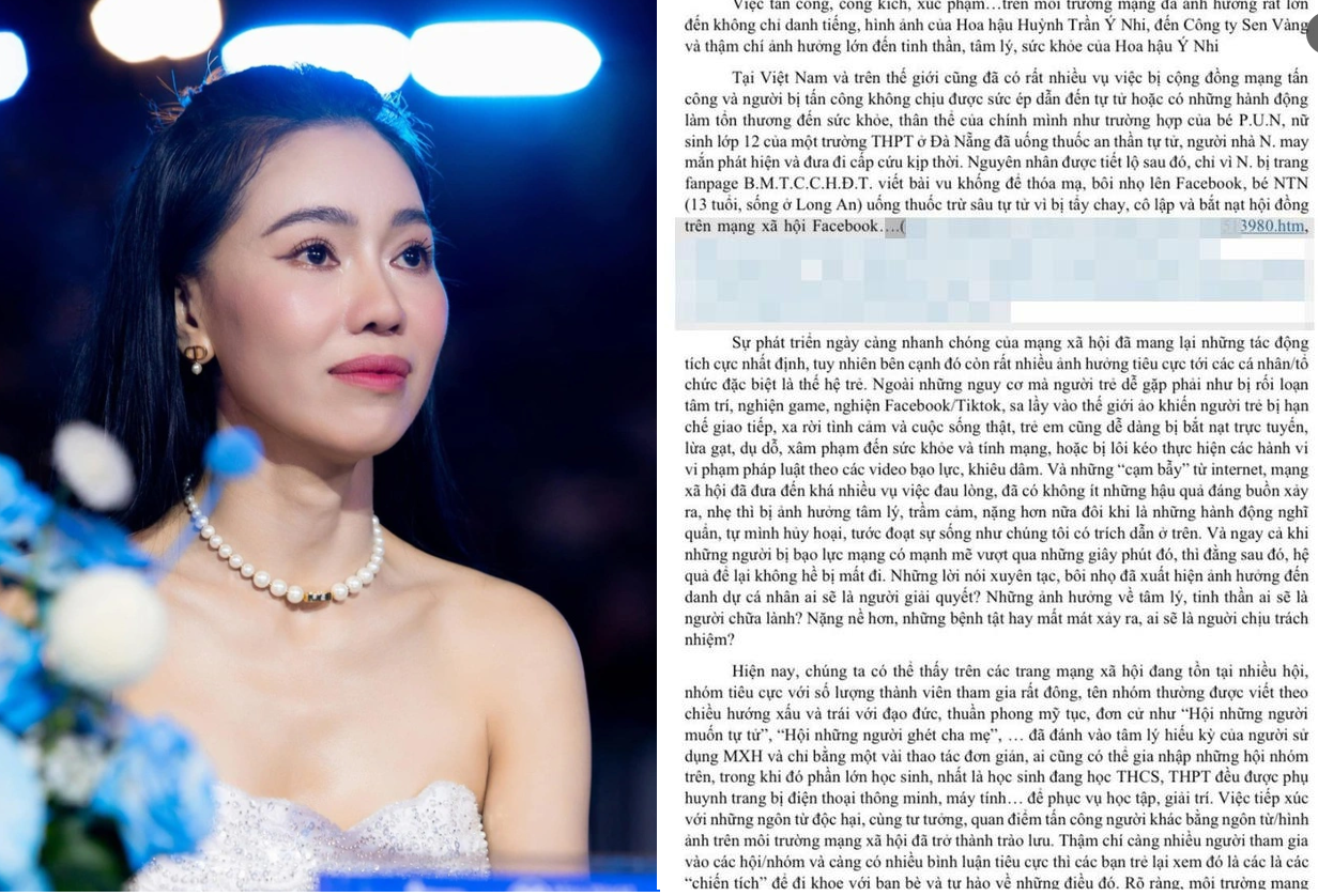 Khác với động thái trên fanpage, mới đây, với vai trò trưởng ban tổ chức Miss World Vietnam 2023, bà Phạm Kim Dung đã có văn bản gửi đến các cơ quan chức năng nhằm đề xuất “chia sẻ, hỗ trợ Hoa hậu Huỳnh Trần Ý Nhi” do bị bạo lực mạng. Trong văn bản này, “bà trùm Hoa hậu” tiết lộ Hoa hậu Ý Nhi đang bị đe dọa nghiêm trọng về mặt sức khỏe, tinh thần khi bị công kích, xúc phạm trên môi trường mạng.